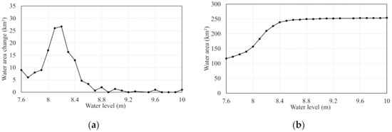 (a) Change of water area for every 0.1 m rise of water level. (b) Cumulative water area with water level in BYDL.