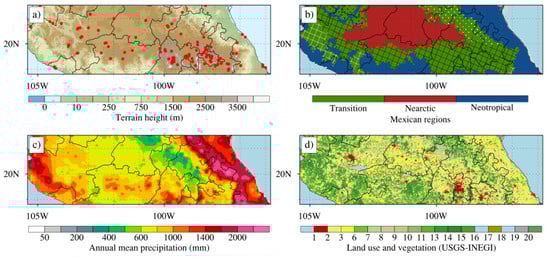 Due to its geographical position between the Pacific Ocean and the Gulf of Mexico, the study area is influenced by tropical cyclones, cold fronts and easterly waves. These weather systems have a significant impact on the natural characteristics of this zone; see Figure 1d. For example, the center-north region is dominated by drylands, pastures and shrublands (in yellow tones), associated with the drier portion of the domain. In contrast, the center-south shows abundant vegetation with evergreen and deciduous forests (in green tones). In the eastern part, the coastal plain of the Gulf of Mexico, irrigated and dryland croplands dominate, while at the highest elevations, woodlands dominate. The western sub-region is dominated by cropland/woodland. It is important to mention that two of the most populated cities in Mexico, Mexico City and Guadalajara, are located in the study area (in red tones).