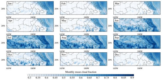 Monthly distribution of mean cloud fraction based on Moderate-Resolution Imaging Spectroradiometer (MODIS) cloud data (2008–2017) with a horizontal resolution of 0.1 degrees.
