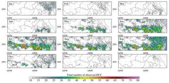 The monthly distribution of observed DCC frequencies on a grid with a spatial resolution of 0.1 degrees in the study area is presented in Figure 3. Note, the numbers are considered to represent single convective events for each grid box. As for the cloud fraction, wet, dry and transition phases are noticed. In the first two winter months, the higher frequencies are located over the Gulf of Mexico and can be related to the passage of mid-latitude frontal systems enhanced by orographic effects [], which may also consist of high COTs and low CTPs. In the next two months, in the dry season, not more than 30 DCCs are observed. May is the first transition phase, and it is when the terrain features start to play a significant role in the increase of observed DCC frequency. Between June and September, the wet phase is established. In this period, the highest observed DCC frequencies are extended along the mountains of the TMVB. Some portions of the domain show total values of over 100 DCC events per month; i.e., about 10 events per month on average or one-third of total days with convective activity. The spatial distribution of observed DCC frequency, especially in this active phase, is consistent with the spatial distribution of cloud-to-ground lightning activity described by Kucieńska et al. [], mainly in the western part of the domain. In this wet season, the interaction of the moisture fluxes from the Gulf of Mexico and then from the Pacific Ocean (in late summer) with the terrain features seems to modulate the deep convection activity. The spatio-temporal behavior of the convection shown here shares some main characteristics with the results of Cavazos and Hastenrath [] who described the convection and rainfall in Mexico and their relationship with the Southern Oscillation using highly reflective cloud data, upper air soundings and surface ship observations; for example, the peak activity in September along the east coast of the domain and the highest DCC frequency in the summer months in central Mexico. Another remarkable aspect is the spatial transition from east to west of the observed DCC frequency; possible reasons for this are discussed later. October is identified as a second transition phase. Although the observed DCC frequencies are low, the most active zone is over the western portion of the TMVB. The last months, November and December, follow the same pattern as January and February, but with a general decrease, even in the Gulf of Mexico. A possible explanation comes from the change of atmospheric circulation patterns and moisture availability. At this stage, dry and cold air masses from the north begin to have some influence on the study area [,]. These air masses work as convective inhibition elements, mainly in the northern portion of the complex terrain of the TMVB.