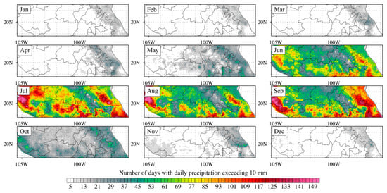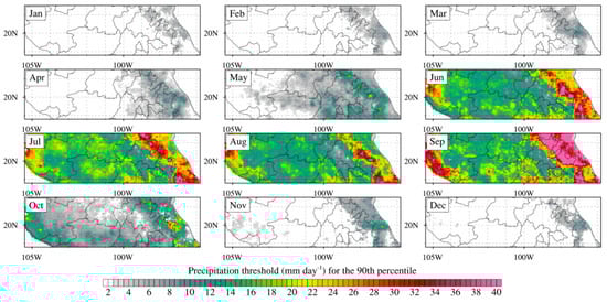 To assess the spatio-temporal relationships between the observed DCC frequency and extreme precipitation events, the monthly distribution of the number of days with daily precipitation exceeding 10 mm (Figure 4) and the monthly distribution of precipitation threshold for the 90th percentile (Figure 5) were computed using the CHIRPS dataset. The 10 mm threshold of daily precipitation represents heavy precipitation days and is useful to identify the regions in which these events are common (adopted from the European Climate Assessment (ECA) indices of extremes). On the other hand, the 90th percentile helps to characterize the behavior of the extreme precipitation events within the study area. The similarity between the spatial-temporal distributions of heavy precipitation days (from CHIRPS, Figure 4) and convective frequency (from MODIS, Figure 3) is evident. Between June and September, the wet phase is identified, with the higher values (i.e., the most days) also located over the higher elevations. The mountainous areas at the west of the Gulf of Mexico, the central part of the TMVB and the Pacific Ocean hold the highest values, with a maximum of 175 heavy rainy days in August. Taking into account the fact that the total number of days analyzed is 3653 for 10 years, the wet areas have about a 5% occurrence (using all the days available). Concerning the precipitation thresholds obtained from the 90th percentile (Figure 5) the Gulf of Mexico stands out with more than 75 mm of daily precipitation in the summertime. The average of the wet phase (June to September) ranges higher than 40 mm/day over the regions identified with more intense rainfall activity. Again, higher values are associated with higher elevations, but in this case, the area of the Gulf of Mexico is dominant. This situation can be associated with moisture fluxes and their interaction with the local topography, as suggested by Giovannettone and Barros [], and the possible contribution of the sea breeze. For the area of the central part of the TMVB, the threshold values range between 20–25 mm/day. One of the most important findings here is the exceptional variety of the behavior of the extreme precipitation events in a relatively small geographical area. Whereas the precipitation thresholds in the mountains near the Gulf of Mexico reach 50 mm/day or more, just a few kilometers to the west, the thresholds decrease to values close to 10 mm/day, indicating the great importance of local conditions.