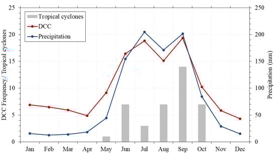 Monthly domain-average of deep convective cloud frequency, accumulated precipitation and tropical cyclone activity. The red line represents the domain-averaged total number of observed DCC based on MODIS data with a horizontal resolution of 0.1 degrees; the blue line represents the domain-averaged monthly mean precipitation amounts based on CHIRPS data with a spatial resolution of 0.05 degrees, and the grey bars represent the number of tropical cyclones that affected the study region. All parameters are shown for the period 2008–2017.