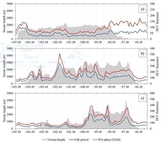 For the cross-section at the constant latitude of 20.5 degrees north (northern part of the domain), the observed DCC frequency shows the Gulf of Mexico as the most active region. The western part also shows relatively high frequencies. As expected, this cross-section shows a relatively stable behavior since the transect includes the dry highlands of the domain and fewer terrain height differences. The correlation coefficients for this section are −0.67 for the full period and −0.45 for the wet phase. In the second cross-section, at the constant latitude of 19.5 degrees north, which is just over the TMVB, the influence of the Pacific Ocean is evident in the western part of the domain, with peaks of frequency just over the windward side. The altitude differences mark, in this plot, the higher frequencies of the observed DCC. The correlation values for this transect are 0.63 for the full period and 0.53 for the wet phase. Finally, in Figure 7c at the constant latitude of 19.0 degrees north, including the southern portion of the TMVB and highest elevations, the correlation values increase to 0.77 for the full period and 0.76 for the wet phase. The increase in the frequency of the DCC observed in the eastern part of the domain indicate the significant role that the fluxes from the Gulf of Mexico and mountainous areas play in the generation of deep convective clouds. The relatively high correlation coefficient between observed deep convective clouds and terrain height is a strong indicator of the considerable role of complex topographic features in the forced convection processes within the TMVB region. For spatial distribution maps of seasonal correlation values between MODIS-based frequencies of DCC and CHIRPS accumulated precipitation, we refer to the Figure S1 of the Supplementary Material.