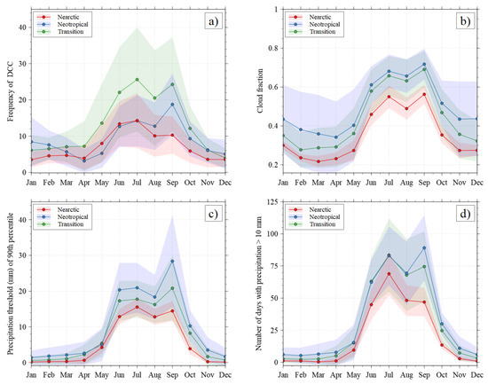 Monthly means (lines) and one standard deviation (shaded areas) of (a) observed deep convective cloud (DCC) frequency, (b) cloud fraction (CF), (c) precipitation threshold values and (d) number of days with precipitation exceeding 10 mm per Nearctic, Neotropical, and Transition sub-regions.
