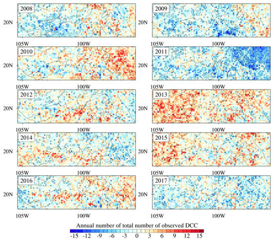 Changes in wind regimens, climatic oscillations and tropical cyclone activity can play a significant role in the spatio-temporal distribution of precipitation [,]. In the study area, where convective precipitation is relevant, research to improve the understanding of the reasons behind spatio-temporal variations of deep convective activity, also on larger temporal scales, can further benefit from estimates of inter-annual variabilities of deep convective cloud frequencies obtained from satellite observations. To this end, the annual anomaly of the total number of observed DCC is presented for the 10 year time period; see Figure 9. The annual DCC anomaly results from the difference between the annual mean (2008–2017) and the value of the year of analysis. From this, the presence of relatively dry (e.g., 2011, 2017) and wet (2010, 2013, 2015) years can be identified within this 10 year time period. The transition between wet or dry years can be divided into an explosive stage—i.e., the change comes from one year to another; for example, 2010–2011—or a progressive stage, where the change comes with an intermediate year; for example, 2011–2012–2013. Interestingly, the transitions identified through the anomalies in Figure 9 are more distinct over the coastal regions, at the east and west edges of the domain, suggesting that these regions are more sensitive to large-scale dynamic changes. It is important to mention that the increase or decrease of observed DCC frequency can be concentrated in only a couple of months within the 10 year time period. For example, from Figure 8a it is evident that the Transition sub-region shows a significant variability mainly in the summer months. Moreover, for the coastal regions, especially in the east, the annual mean DCC frequency difference between two subsequent years (2010 and 2011) can be about twice as large as the largest difference between monthly means inferable from Figure 8a (Neotropical sub-region), indicating the relevant impact of (changes in) large-scale dynamics on observed annual DCC distribution in the study area.
