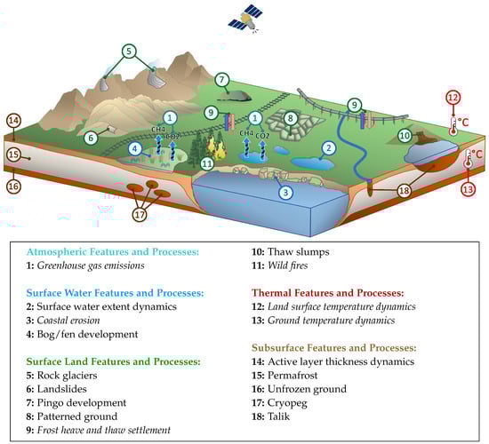 Since permafrost is a subsurface feature, it cannot directly be measured from space. However, the presence and degradation of permafrost is accompanied by various land surface characteristics and processes (Figure 1), which can be detected and analyzed over space and time via satellite imagery. These target characteristics are thereby means to indirectly derive the state of permafrost []. Nevertheless, Earth observation analyses of frozen ground and related land surface features remain challenging due to unfavorable environmental conditions, such as persistent cloud coverage, low light intensities (including polar night) and steep sun angles [] as well as technical limitations such as decorrelation between Synthetic Aperture RADAR (SAR) scenes [,], as described in more detail in the following paragraph. A handful of satellite remote sensing of permafrost associated review articles were published during the last 20 years (Table 2).