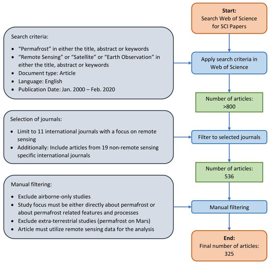 The last stage of the literature selection comprised of a manual screening process of the articles based on the following criteria: (1) Studies that used only airborne remote sensing were excluded, since this review major focus lies on satellite earth observation of permafrost and related features/processes; (2) No extra-terrestrial studies (permafrost on Mars) were included in this review; (3) The study must utilize remote sensing for their analysis; (4) The study focus must be either about or directly connected to permafrost. Therefore, studies that for example, mentioned the term “permafrost” once in the abstract but do not actually investigate permafrost or any of its associated features and processes were excluded from the review process. The remaining 325 articles from 30 international journals were analyzed based on relevant parameters for this review, including: