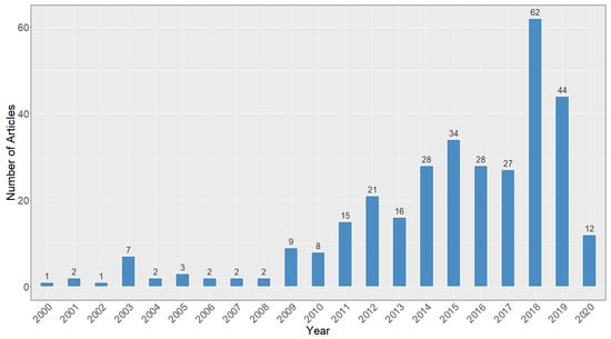 The degradation of permafrost and its effects on the environment gained increasing attention over the past years [,]. This increase in attention can be observed in the number of satellite based studies of permafrost and its associated land features, which grew over the course of the last two decades (Figure 3). Especially during the last decade a higher frequency of articles can be observed, with 2018 featuring the most (62) articles published per year within the scope of this review. In 2018 permafrost was added to the ESA CCI program lineup as an ECV, which could have been a potential driver for the sudden increase in publication frequency [,]. For the year 2020 only 12 articles are shown, however this review also only considered articles which were published until February 2020. Therefore, based on the trend of the last 20 years, a growing number of satellite Earth observation of permafrost related studies can be expected in future years.