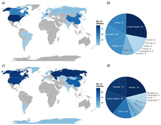 The frequency of studied countries and the nationality of the first authors institutions are visualized in Figure 4. The most frequent nationality of the first authors institution is hereby the United States with 91 articles, followed by China (57), Germany (48) and Canada (47) (Figure 4a,b). On the other hand, the most studied countries are Russia with 75 articles, followed by Canada (71), the United States (68) and China (54) (Figure 4c,d). The three countries United States, Canada and China feature major permafrost occurrences (Figure 5), which explains their positions as both highly investigated countries and the most common author countries. Russia, however, appears to be underrepresented within the author distribution, since it is the most frequently researched country across all reviewed articles and features the greatest spatial coverage of permafrost out of any country based on the circum-Arctic permafrost map by Brown et al. []. As already mentioned in Section 2, only English articles were considered for this review, therefore no Russian publications were included. In contrast, Germany stands out by being one of the top authors, despite of its lack of permafrost with local exceptions for example, mountain permafrost at the Zugspitze [].