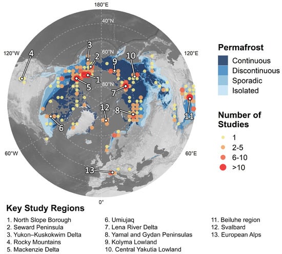 The study area distribution of the reviewed articles for the Northern Hemisphere together with the circum-Arctic permafrost map by Brown et al. [] (bluish coloured areas). One study may have several study areas. A shaded relief by [] was utilized as a background map. All data is visualized in a polar Lambert azimuthal equal area projection. Circum-Arctic studies were excluded from this visualization. Thirteen key regions with study clusters are marked and labeled.
