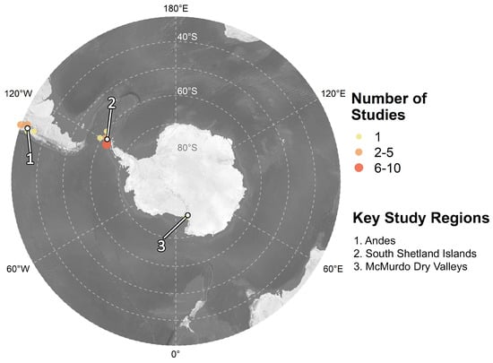 While the majority of permafrost is distributed over the Northern Hemisphere and so are most of the research articles (94%), some authors also investigated permafrost related features and processes on the Southern Hemisphere (Figure 6). One of the geographical research hotspots are hereby the Andes with a focus on rock glacier kinematics and mountain permafrost distribution [,,,,,,,] (Figure 6 key region 1). Moreover, the Antarctic features a noteworthy amount of permafrost related research. Studies are almost entirely located across the South Shetland Islands with a focus on Byers Peninsula on Livingston Island [,,,,,] (Figure 6 key region 2), whereas a single article examined rock glaciers in the McMurdo Dry Valleys [] (Figure 6 key region 3). Lastly, in a recent study by Obu et al. [] near-surface permafrost temperatures were modelled for the entire Antarctic. The lowest temperature was hereby modelled to be −36 °C, which marks the lowest permafrost temperature worldwide according to global modelling efforts [].