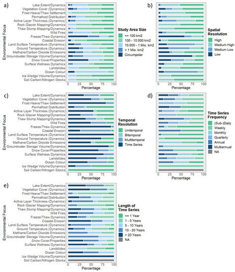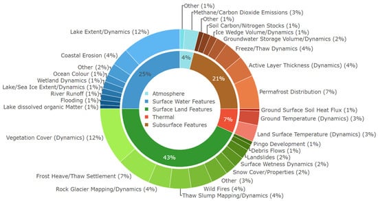 The two least studied categories are “Thermal Features and Processes” with ∼7% and “Atmospheric Features and Processes” with ∼4% of the share across all studies reviewed in this paper. Within the category “Thermal Features and Processes”, the research focus “Land Surface Temperature (Dynamics) (∼3% in total and ∼50% in category) is slightly more researched than “Ground Temperature (Dynamics)” (∼3% in total and ∼43% in category). Studies associated with the category “Atmospheric Features and Processes” mostly focused their analyses on “Methane/Carbon Dioxide Emissions” (∼3% in total and 75% in class).