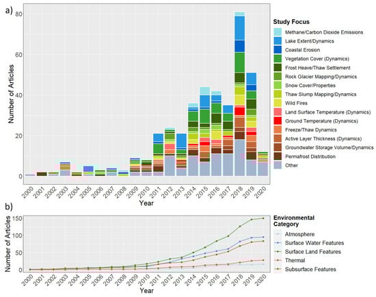 As part of the “Surface Water Features and Processes” category, the dynamics and extent of lakes was regularly studied throughout the last 20 years, with peaks in 2013 and 2018. Within the framework of this review, first efforts in studying coastal erosion using satellite remote sensing data and linked to permafrost degradation were conducted in 2008, but the topic did not gain increasing attention before 2018.
