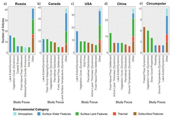 Study focus distribution for the top four most studied countries and circum-Arctic studies. Featured countries are Russia (a), Canada (b), United States (c), China (d) and circumpolar studies (e).