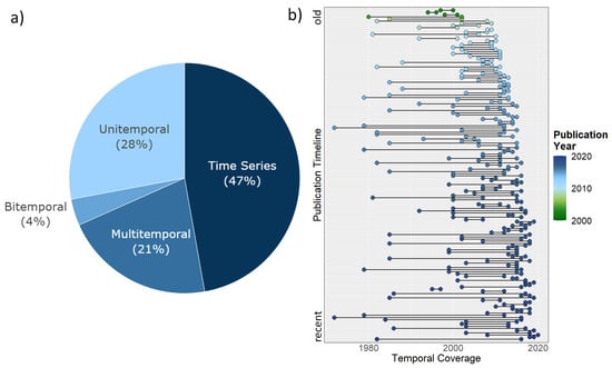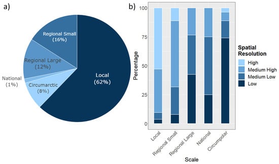 Another relevant parameter during this review process is the spatio-temporal resolution of applied satellite data. The temporal resolution was hereby divided into the four categories “Unitemporal”, “Bitemporal”, “Multitemporal” and “Time Series”. In the context of this review, studies are considered to be multitemporal, if 3–9 time steps are used for analyzing the temporal development, whereas a “Time Series” study is defined to cover at least 10 time steps. The spatial resolution was categorized into the four classes high (<10 m), medium high (10–100 m), medium low (100–1000 m) or low (>1000 m). Furthermore, in this study the different scales are defined as local (<10,000 km), regional small (10,000–250,000 km), regional large (>250,000 km), national or circum-Arctic.