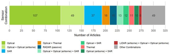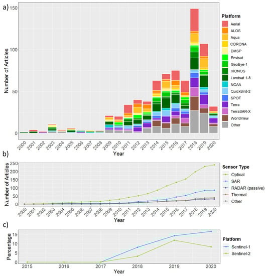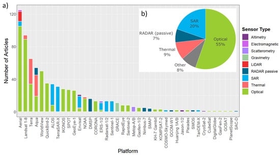 Even though this review focuses on studies that utilized satellite Earth observation, “aerial” was also considered for the platform frequency analysis since many articles employed aerial imagery either as a historical reference, for validation or other complementary use with satellite data and is therefore included for completeness. Lastly, permafrost-related and openly available data sets which were commonly applied across the reviewed articles are presented.