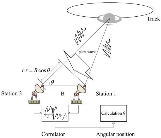 Because the distance between the observation target and the earth is long enough, the signals received by the station can be approximately regarded as the plane waves. In addition, due to the different geographic locations, the stations will receive the same wavefront signal at different time points. Therefore, there will be a delay between the two stations when receiving the same signal. According to the geometric relationship in Figure 1, the delay τ can be calculated as the following: