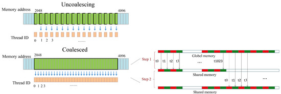 Since the data type is complex, when we operate on the real or imaginary part of the data on the global memory, the uncoalescing problem will be encountered. As shown in Figure 6, the discontinuous storage areas of global memory are accessed, and will lead to the performance decline. If the data access is continuous, one instruction can read more data. This means fewer instructions will be used to perform data access operations. Thus, the data reading time will be shortened. Memory coalescing technology can greatly improve the speed of global memory access. The hardware will detect whether the location accessed by the thread is an adjacent location in the global memory. When 16 threads of a warp are coalesced in memory transactions, the bandwidth of the global memory will be maximized. Therefore, shared memory is employed to solve the uncoalescing problem in this article, as shown in Figure 6. We employ a continuous method to access data from global memory to shared memory, firstly. Since there is no need to consider the order of access when using shared memory, the problem of uncoalescing problem can be avoided.