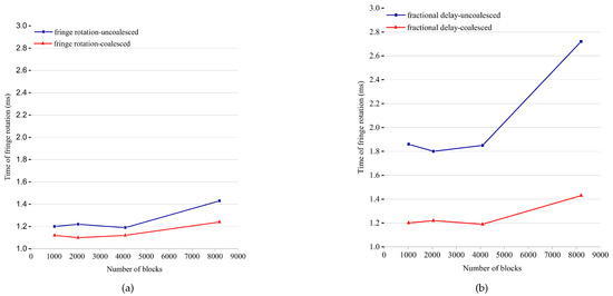 Figure 8 depicts the calculation time of fractional delay and fringe rotation for one channel data of a station. Through shared memory bridging, the problem of discontinuous data access is solved. When reading data from global memory, the bandwidth of the global memory is fully utilized. After solving the uncoalescing problem, the execution time of the algorithm is significantly reduced. From Figure 8, it can be seen that the processing time of fringe rotation and fractional delay is reduced along with the decrease of the block number. If multi-point computing tasks are allocated on a thread, the computing resources of the thread can be fully utilized, and sufficient hardware resources can be allocated for each thread. The aforementioned optimization methods can reduce the time of processing data. Furthermore, the results verify the effectiveness of the method proposed. For the fractional delay, the time change is more obvious after optimization. According to the analysis of the algorithm in Section II, although the complexity is the same, the amount of calculation is different between the fringe rotation and the fractional delay. Therefore, the thread in Kernel1 has a larger amount of calculation and consumes more hardware resources. Thus, the repartitioning of GPU resources has less impact on edge rotation.
