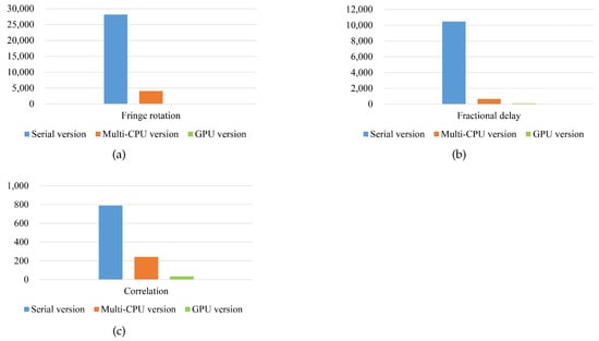 Table 4 is consistent with the content in Table 3. Compared with the fringe rotation, fractional delay and correlation of the multi-CPU version, the acceleration ratio of the GPU version has reached 124.7 × , 6.4 × , and 7 × , respectively. Specifically, the part of “Calculation” and “Overall|” achieves about 28.6 × and 4.7 × speedup. It can be seen from the results that the multi-CPU version requires about 5 s to process data of 6 s observation time. Although the multi-CPU version can achieve real-time processing, the GPU version only needs 1s, which can further improve the processing capability. This means that it may take 5 such machines to achieve the GPU computing effect, as shown in Figure 4. The details of the time consumption on the three versions are displayed in Figure 10. It can be seen, in Table 3 and Table 4, that the acceleration effect of the fringe rotation is more obvious than the fractional delay. The main reasons include two sides: firstly, the fractional delay contains the FFT operation, and the FFT operation has the highest time complexity; secondly, Compared with the Intel IPP library, the optimization effect of CUDA CUFFT has the limited optimization capabilities. Therefore, the optimization effect of the fractional delay is not as good as the fringe rotation.
