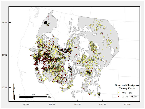 Cheatgrass (Bromus tectorum) was unintentionally introduced in North America in the late 19th century from Eurasia and is now found in every state in the contiguous US [1]. In the western US, it has become a dominant component in many shrubland and grassland ecosystems [2,3], resulting in an increase in fine fuels that can lead to a cycle of increased fire frequency, fire severity, and irreversible loss of native vegetation and wildlife habitat [4,5,6]. Detailed spatial information on the presence and abundance of cheatgrass is needed to better understand factors affecting its spread, assess fire risk, and be able to identify and prioritize areas for invasion treatment and fuels management. However, such information is lacking for much of the ostensibly invaded area in the western US, with exceptions for parts of the Great Basin ecoregion [7,8,9,10,11,12,13].