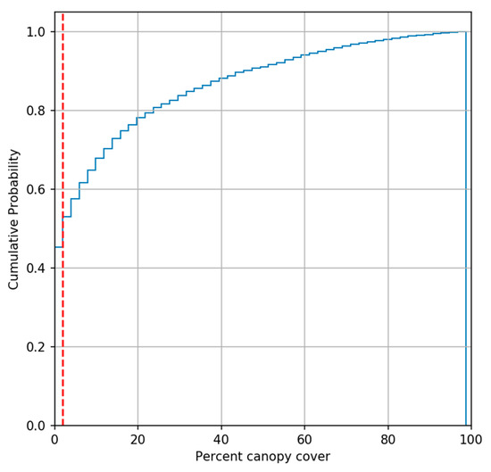 Cumulative probability distribution of cheatgrass canopy cover at field sample locations. The red line illustrates a strong break at 2% canopy cover and is used to define cover classes for this study.