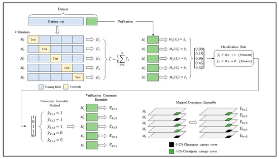 Process diagram illustrating how cross-validation and verification performance metrics (E) are assessed. Beginning in the upper right, the dataset is split into training and verification sets. During cross-validation, five iterations of a model () are trained and tested on different folds of the training set and performance () is averaged across folds (). Conversely, verification performance is assessed by ensembling the predictions from each of the k-fold models () using the consensus method, which yields k estimates performance (). This same process is applied to each map pixel.