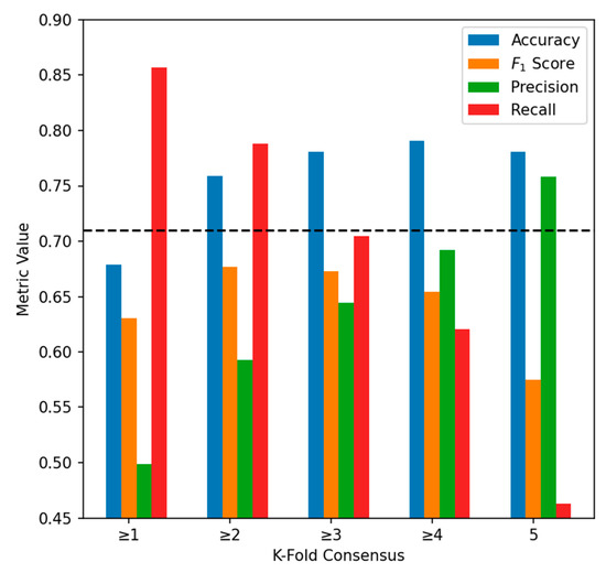 Verification overall accuracy, F1 score, precision, and recall across k-fold consensus levels for the DNN-D4 model figuration. The horizontal dashed line indicates our threshold for acceptable accuracy (>71%).