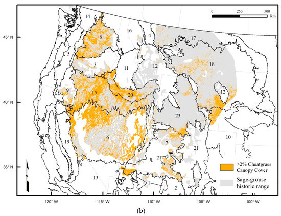 Predicted distribution of cheatgrass occurrence (>2% canopy cover) in the historic range of sage-grouse (excluding areas classified as non-target land cover types) depicted as: (a) the spatial agreement (i.e., consensus of k-fold predictions), and (b) accuracy-F1-balanced consensus of k ≥ 3 overlaid by EPA Level-III ecoregion boundaries (numbering corresponds to ecoregion names in Table 8).