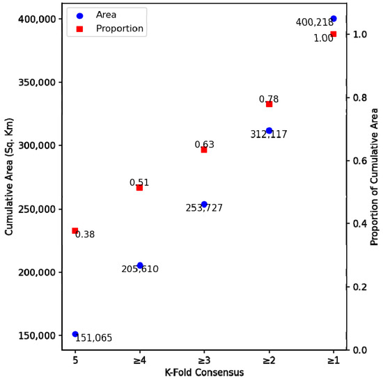 Cumulative areas (blue dots) and proportions (red squares) of the predicted area occupied by cheatgrass for each k-fold consensus level.