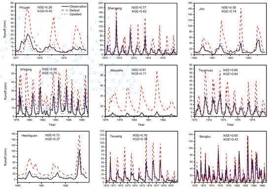 Figure 3 presents the monthly discharge of the simulations from the default and calibrated/updated parameters and the observations over nine river basins, which were selected to be regionally representative and distributed among diverse climates. The model performance was considerably better when using the updated parameters rather than the default parameters (Section 2.4.1). For most basins, the simulations with the default parameters tended to have higher discharges, especially overestimating the peak flow during summers, such as in Phujym, Jilin, Heishiguan, and Tsuuang. In contrast, the simulation with the updated parameters was able to capture the peak flow avoiding overestimation. For the basins with small rainfall and runoff (i.e., Shetang, Maojiahe, and Tsyamusy), the simulations with the default parameters do not match the observations well during the low-flow seasons, but the performance was substantially improved after parameter update and calibration. Overall, the comparisons revealed that the runoff dynamics were well captured after parameter update and calibration, and consequently the model performance was improved relative to the simulation with the default parameters.