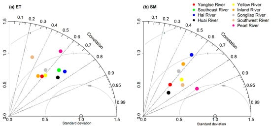 Statistics for comparisons between observations and simulations of (a) ET and (b) SM in each basin. The x and y axes indicate the standard deviation.