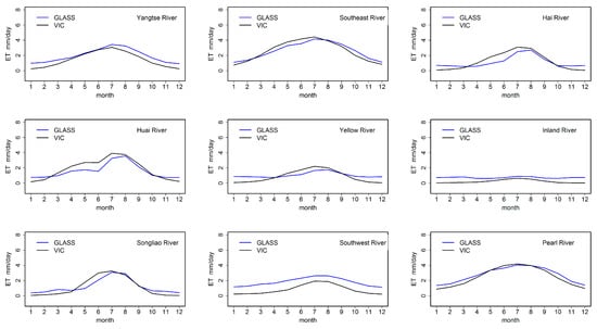 Comparisons of ET between the VIC simulation and the GLASS product of mean monthly ET for nine basins.