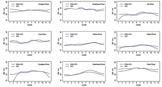 Comparisons of mean monthly SM between the simulations and the ESA-CCI retrieval for the 0–10 cm soil layer over the nine basins.