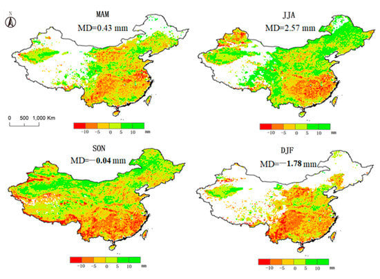 Comparisons of ET between the VIC simulation and the GLASS product of seasonal differences (VIC minus GLASS) for four seasons, from top to bottom, spring, summer, autumn, and winter. MD denotes the mean differences.