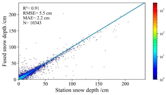 - The fused dataset based on the RFR model performed better in winter and spring than autumn because there were more training samples in winter and spring; the average snow depth values in winter and spring were deeper than in autumn.