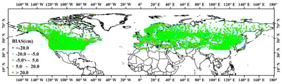 - Comparing AMSR-E, NHSD, GlobSnow, MERRA-2, ERA-Interim, and the new fused snow depth datasets with in situ observation snow depths, the result shows that the original five snow-depth datasets have weak correlations with the observed snow depth. The best coefficient of determination between the five original snow depth products and the observations was 0.15 (i.e., the coefficient of determination between GlobSnow and in situ observations), while the value of the fused snow depth increased to 0.91. The spatial pattern of BIAS between fused dataset and observations indicates that the fused dataset performs very well. The comparison of the fused snow depth product with five independent in situ snow observation sites shows that it is the most accurate. However, in some complex situations with deeper snow depths (>200 cm), like in alpine regions and mixed pixel areas, the fused snow depth also does not perform well.