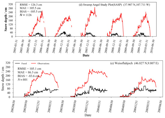 3.3. Accuracy Assessment of the Fused Snow Depth Dataset at Five Independent In Situ Snow Observation Sites