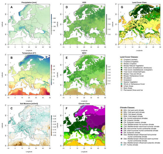 In order to compare the response of different VIs to meteorological drought events, in this study, the anomalies of NDVI and VOD VIs during dry and wet periods (derived by using SPI-12 time series) are statistically compared over 24,442 pixels located mainly in central Europe within the boundary of 10 W and 50 E longitudes and 30 N and 70 N latitudes. The selected boundary consists of 16 different land cover and 15 different climate classes that make it an appropriate region for investigating the interactions between different VIs and drought events on different climate and land use conditions. The spatial distribution of the long-term average of different climatic variables of precipitation [38], temperature [38], soil moisture [39,40,41], VOD [17,42,43], and NDVI [44], and the variety of climate [45] and land use [46] classes of studied area are presented in Figure 1. The detailed information about the time period, drought indices, and the steps that have been performed for the statistical comparison of VIs are presented below in Section 2.2 and Section 2.3.