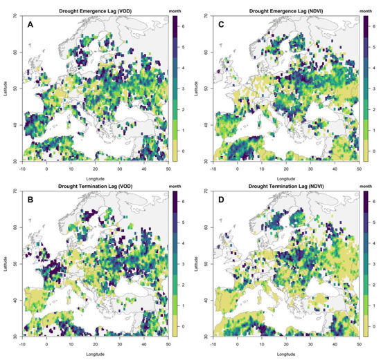 Moreover, a comparison of the response time of vegetation covers to the emergence and termination of meteorological droughts (Figure 2A,C for VOD and Figure 2B,D for NDVI) shows that, on average, there is a monotonic relationship between the response time of VOD and NDVI VIs to the meteorological drought events (i.e., when NDVI shows a higher lag time for the response of vegetation covers to meteorological droughts, VOD also shows a high lag time and vice versa); there are also regions in which the response time of VIs differ from each other (e.g., Iberian Peninsula and other regions around the Mediterranean Sea).