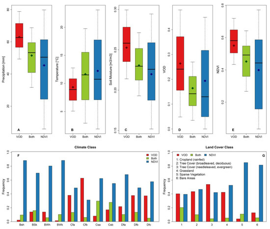 The impact of different climate and land use conditions on the significance level of vegetation cover response to the meteorological droughts are investigated through analyzing of spatial variation of different climate and land-use variables (i.e., total monthly precipitation, average temperature, average soil moisture, average VOD, and average NDVI) over pixels in which anomalies of VOD and NDVI VIs exposed to have significantly different average values during dry and wet periods (Figure 4A–E). Moreover, the coverage percentage of the pixels with an identical climate or land use class by each VI (either VOD, NDVI, or both) is calculated to determine the performance of each VI in the identification of agricultural droughts over different climate and land use classes (Figure 4F,G).