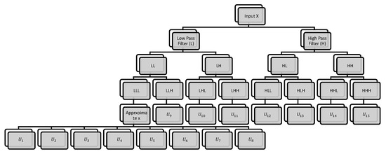 where a 0 , b 0 are the dyadic scaling parameter and the shifting parameter, respectively. In multistage analysis, the signal x(t) will be recovered by the combination of different levels of wavelet and scaling function ( t ) and ψ ( t ) . Generally, Equation (3) can be rewritten for discrete signal x(n) as