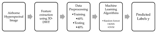 Figure 1 depicts the schematic representation of the proposed system. For this work, Indian Pines [29] and Salinas [30] airborne HSI datasets were used to experiment the proposed model. A hyperspectral image is a vector in high-dimensional space. The principal component analysis method (PCA) is used to reduce the subspaces in high dimensional data, producing computably compact image representation [31]. This represents all the pixels in an image using a new basis function along with the directions of maximum variation [26]. The DWT maps an image into other basis functions. These basis functions must have properties such as capture scale, invertible, orthogonal, square, pixel reduction, multi-scale representation, invertibility and linearity. Initially, the 1D-DWT is applied on the rows, and then, the output of 1D-DWT is fed along with the columns. This creates four sub-bands in the first stage of transformed space such as Low-Low (LL), LowHigh (LH), HighLow (HL) and HighHigh (HH) frequencies [32]. The LL band is equivalent to a downsampled (by a factor of two) version of the original image. Then, these features are applied to the random forest [33], KNN [33] and SVM [34] classifiers, and the results are compared with existing classification algorithm as decision tree, KNN and SVM without the use of the wavelet features.