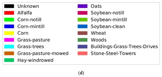 Figure 5. Indian Pines hyperspectral image: (a) Original Indian Pines data cube (145*145*224). (b) The Indian Pines ground truth image. (c) The training region of interest (ROI). (d) The classification legend for different classes.