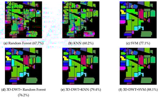 Initially, the 3D-DWT+random forest method is evaluated with labeled samples that have 60% data as training and 40% of data as testing samples. Principal component analysis (PCA) [39] is used to reduce the number of feature parameters to 15, to extract the significant information. the parameters considered in this work are (i) gamma value and (ii) epsilon value, which are tuned up to boost the performance of the proposed experiment. All the machine-learning algorithms were validated by K-cross validation (K = 10). Splitting the training dataset into k folds is part of the k-fold cross-validation process. The first k−1 folds are used to train a model, while the remaining kth fold serves as a test range. In each fold, we can use a variant of k-fold cross-validation that maintains the imbalanced class distribution. It is known as stratified k-fold cross-validation, and it ensures that the class distribution in each split of the data is consistent with the distribution of the entire training dataset. It also emphasizes the importance of using stratified k-fold cross-validation of imbalanced datasets to maintain the class distribution in the train and test sets for each model evaluation. In SVM, kernel function with 3rd order polynomial were used. Classification results of all the methods on Indian Pines dataset are shown in Figure 6, and the overall accuracy, average accuracy and kappa coefficients are reported and compared in Table 2. The best obtained results are highlighted in Table 2. Three-dimensional DWT+SVM performs better in terms of all performance metrices and larger improvement in this scenario; 3D-DWT+KNN and 3D-DWT+decision tree trail somewhat behind (79.4 and 76.2% OA, respectively). As shown in Table 1, 12,602 training samples from the Indian Pines data are selected. The overall accuracy of 3D-DWT+SVM is 88.3%, which is 14.5% larger than that of traditional SVM (77.1%). The classification maps of 3D-DWT+SVM are more closely related to the ground truth map. The observed results lead to misclassification due to the consideration of only spatial information, which can be rectified by including both spectral and spatial information. Wavelet coefficients from eight sub-bands capture the variations in the respective dimensions by implementing 3D-DWT over spatial–spectral dimensions. The local 3D-DWT structure is represented in three ways by the energy of the wavelet coefficients.