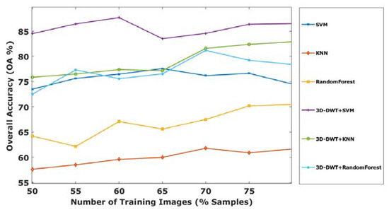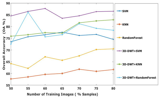 Initially 60:40 ratios are used for training and testing. Later, the effectiveness of our proposed method is evaluated with different number of training samples such as 50, 55, 60, 65, 70, 75 and 80% of supervised samples of each class from the Indian Pines HSI dataset. The overall accuracy for different training ratio is shown in Figure 8. The plot shows that out of several approaches proposed, the 3D-DWT+SVM achieves better performance in all aspects. Meanwhile, 3D-DWT+KNN and 3D-DWT+random forest obtain the second and third highest OA.