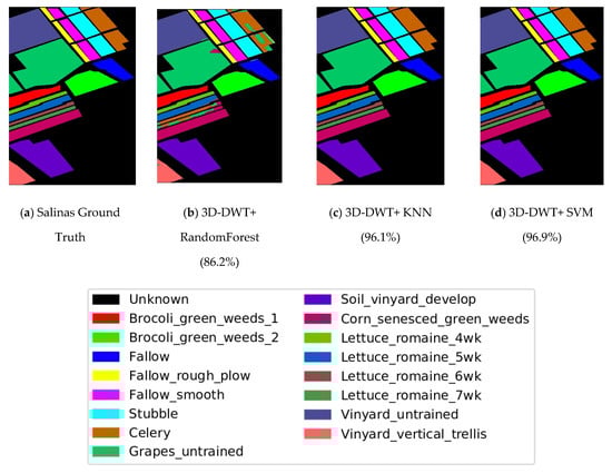 From Figure 11 and Table 4, one and two best accuracies are highlighted: 3D-DWT+SVM performs better in terms of all performance metrices and larger improvement in this scenario; 3D-DWT+KNN and 3D-DWT+decision tree trail behind 3D-DWT+SVM with 96.1 and 86.2% OA, respectively [41]. Table 3 shows that 159,206 samples from Salinas Scene hyperspectral dataset were selected for training. The overall accuracy of 3D-DWT+SVM is 96.9%, which is about relative accuracy 7.54% larger than that of traditional SVM (90.1%). The classification maps of 3D-DWT+SVM is more closely related to the ground truth map.