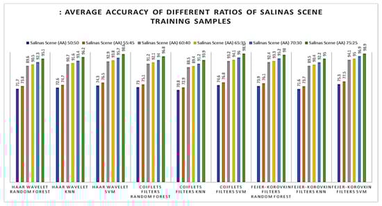 Later, the effectiveness of our proposed method was evaluated with different number of training samples such as 50, 55, 60, 65, 70, 75 and 80% of supervised samples of each class from the Salinas Scene hyperspectral dataset. The OA of different training samples are shown in Figure 11; from this, it is observed that the proposed method of 3D-DWT+SVM achieves better performance in all aspects. Meanwhile, 3D-DWT+KNN and 3D-DWT+random forest obtain the second and third highest OA. The computation time taken for training and testing datasets for our proposed method are as follows: the training times of 3D-DWT and testing times is 4 to 6 times greater than SVM, KNN and random forest, because it has both spatial and spectral features and a number of object prediction (testing data) in terms of seconds also shown in the Table 7. Figure 12 and Figure 13 show the average accuracy for a different ratio of training and testing images of Indian Pines (50:50, 55:45, 60:40, 65:35, 70:30, 75:25) and Salinas Scene (50:50, 55:45, 60:40, 65:35, 70:30, 75:25), respectively. In this, if we are increasing the number of training samples, increasing average accuracy of each class because both are directly proportional. From the analysis of Figure 11, if we are varying a different ratio of training and testing samples, the overall accuracy is not varying that much because of the unbalanced dataset.