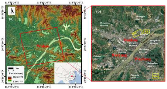 Wuhan (29°58′N–31°22′N, 113°41′E–115°5′E) is located in the east of the Jianghan Plain and the middle reaches of the Yangtze River (Figure 1a). The confluence between the Yangtze River and its largest tributary, the Han River, spatially bounds the three main areas of the city, namely Hankou, Wuchang, and Hanyang (Figure 1b). In the city, rivers and lakes are intertwined, and of the city’s total area is covered by water [23]. Wuhan has a northern subtropical monsoon (humid) climate with abundant annual rainfall of 1150 to 1450 . The rainfall is concentrated from June to August every year, accounting for about of the annual rainfall [24].