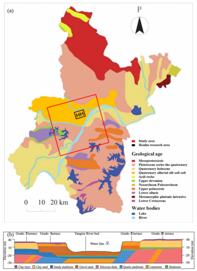(a) Simplified geological map of Wuhan, where units are grouped by age (modified from [24]). The black rectangle represents the location of Houhu (HH), which is the representative research area affected by soft soil geological factors and is investigated in detail in this paper. (b) Typical cross-section of Wuhan’s geological structure, with details on lithologies and their thickness (reproduced from [25]).